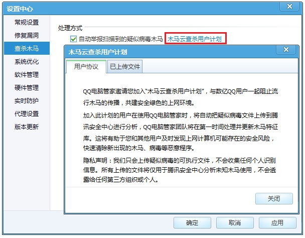 QQ電腦管家鄭重承諾,我們只會收集疑似病毒木馬的程序文件,不會掃描任何非相關的文件,不會收集任何個人識別信息。所有上傳的文件將僅用于騰訊安全中心分析未知木馬使用,不會透露給任何第三方組織。