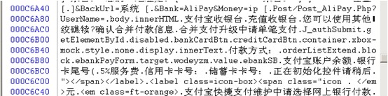 在進(jìn)行完以上的準(zhǔn)備活動(dòng)后,此木馬就開始監(jiān)控用戶的所瀏覽的網(wǎng)址,區(qū)別于以往的代碼注入,或者劫持API之類的手法,此類木馬使用了一種更為簡(jiǎn)便而且行之有效的方法:定時(shí)器。而這種手段可能被某些主動(dòng)防御所忽略。此類木馬一般設(shè)置了三個(gè)或以上的定時(shí)器。觸發(fā)的時(shí)間間隔是200毫秒。這個(gè)時(shí)間間隔足以監(jiān)控到用戶對(duì)網(wǎng)站的操作。其中一個(gè)定時(shí)器,會(huì)通過GetCursorPos獲得當(dāng)前鼠標(biāo)的位置,進(jìn)而獲得當(dāng)前窗口的句柄。然后通過向Webbrowser控件(窗口類名是"Internet Explorer_Server")發(fā)一個(gè)WM_HTML_GETOBJECT的消息獲得IHTMLDocument對(duì)象。獲得此對(duì)象后,木馬作者就可以對(duì)該頁面進(jìn)行任何操作:解析該頁面元素,竊取自己感興趣的任何內(nèi)容,篡改支付信息等等,以下是在病毒中截取到的一個(gè)字符串的片段: