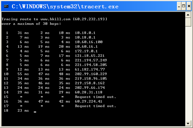 點確認或回車后即可進入命令模式窗口,我們在里面輸入tracert -d www.bkill.com 之后按下回車鍵確認即可追蹤到本地電腦到比克爾網站所在地的路由器線路。如下圖: