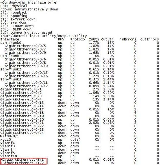 1、首先我們可用命令“dis interface brief”查看交換機的哪一個端口為萬兆端口。這樣會方便我們后邊的查詢。