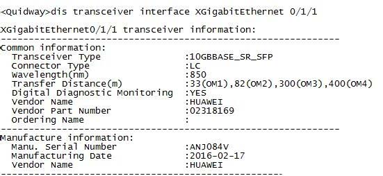3、我們用命令“dis transceiver interface XGigabitEthernet 0/1/1”可以查看設(shè)備端口上的光模塊的常規(guī)、制造、告警信息。
