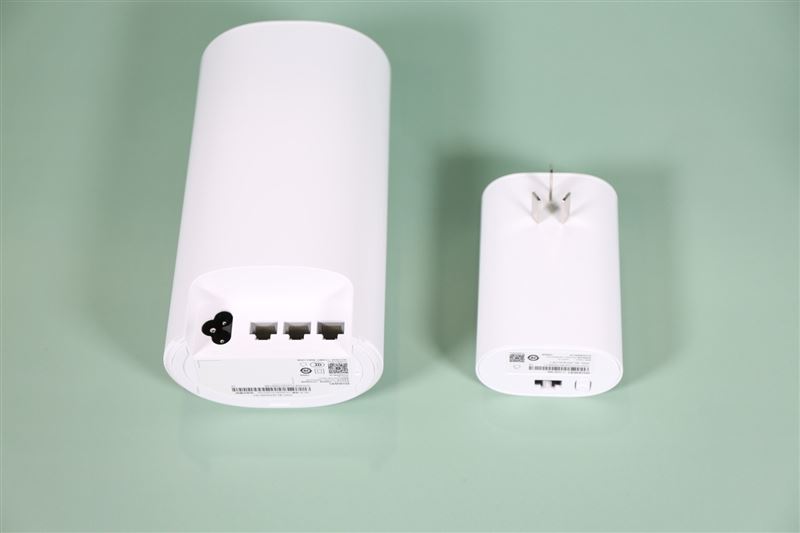 華為路由Q2S采用的是子母式的設(shè)計,皆為橢圓形的外形,主路由體積稍大,子路由體積更為小巧。