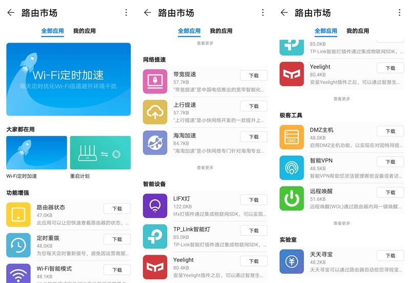 除了這些功能外,華為路由Q2S還擁有一個路由市場,里面提供了數量極多的各種擴展插件。讓華為路由Q2S的可玩性、擴展性進一步提升。