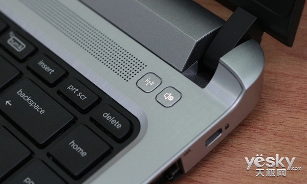 該機電源鍵位于C面左上角,遠離鍵盤避免用戶使用過程中誤觸,開機后電源鍵上白色指示燈會被點亮。與電源鍵相對,在該機C面右上角還有兩枚相對較小的銀色按鍵,分別為WiFi控制和一鍵靜音,簡潔實用。