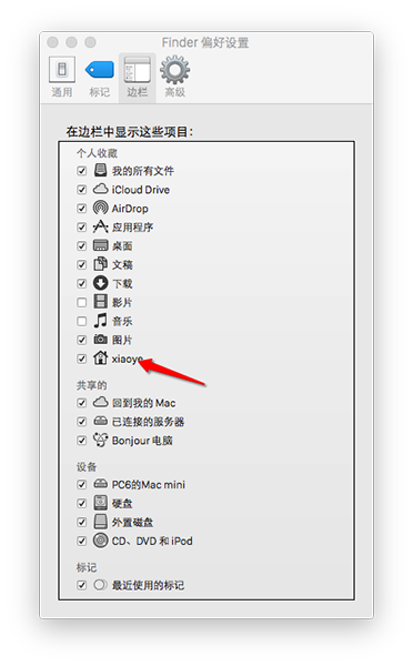 2)打開“偏好設置”后,選擇“邊欄”,在小房子前面勾選上就可以了。