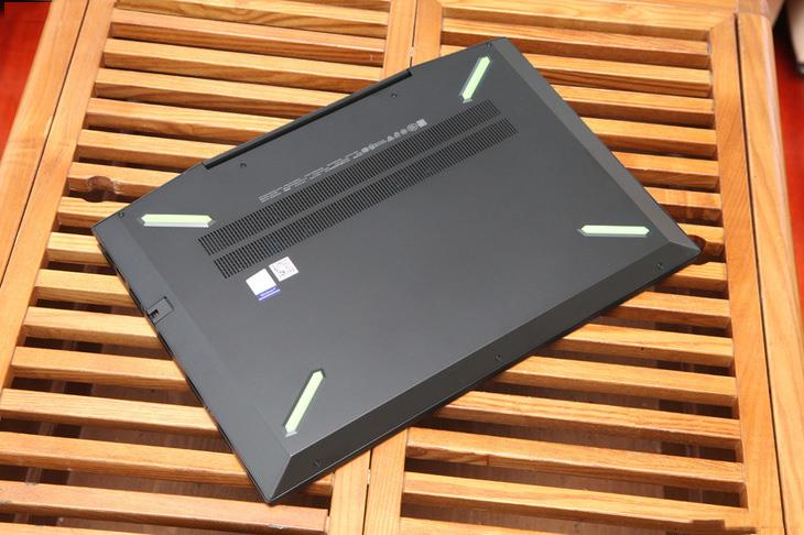 光影精靈 4 代綠刃的楔形設計延續到了機身底部,角度更為夸張。四個橡膠腳墊呈“X”形分布在機身四個方向,頂部靠上的位置有大面積的進風口。