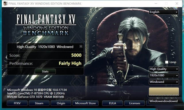 接下來是《最終幻想15》,這款游戲講述的是四個殺馬特青年去別國履行婚約途中沉迷烹飪、釣魚后終將公主娶回家并順便拯救自己國家的故事。我們用自帶的跑分軟件,將畫質調到最高,結果如下: