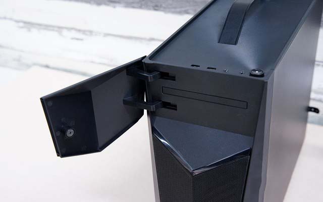 刃9000 3代前端接口位于頂部靠右側位置,2個USB 3.1接口、1組耳機和麥克風插孔方便用戶使用,旁邊設計有電源鍵。此外,前面板上部區域可以打開,預留有光驅位。