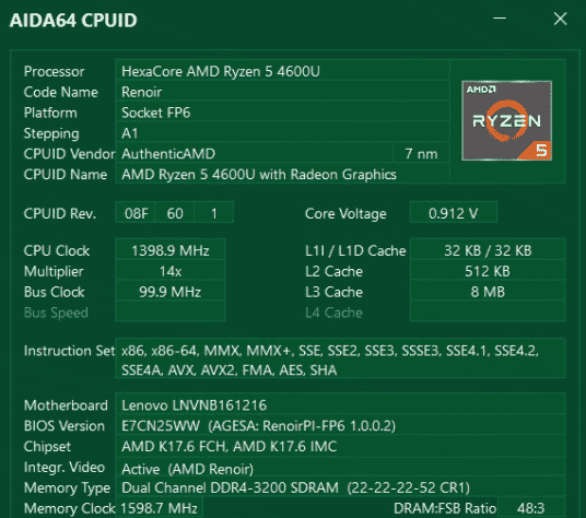 該機搭載的這顆Ryzen 5 4600U移動處理器采用7nm制程,基于ZEN2架構打造,6核/12線程設計,基準頻率2.1GHz,動態擴頻可達4.0GHz,TDP僅有15W。