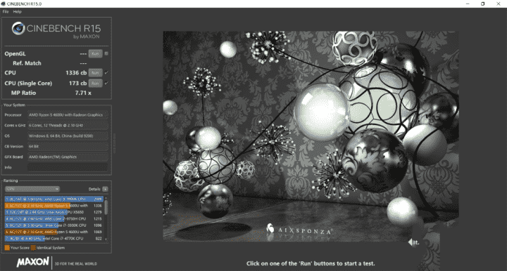 聯想小新15 2020銳龍版的CINEBENCH R15最終測試結果為:CPU多核成績為1336cb,單核成績為173cb,與Intel i7-10750H相比,單核心性能略低,但是多核心性能超出了6%左右,要知道這可是TDP為15W的低電壓處理器,而i7-10750H是45W的標準電壓處理器,如果與Intel 15W的i7-10510U相比,那更是翻倍的碾壓。可以說Ryzen 4600U以15W的標定TDP基本超越了Intel第十代酷睿移動版家族的主流型號。