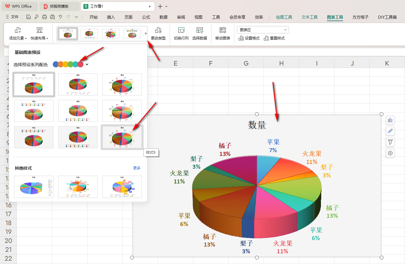 5.此外,我們還可以將工具欄中的餅圖樣式擴展圖標(biāo)點擊打開,選擇我們自己喜歡的顏色,然后再選擇一個喜歡的樣式即可進行更改,如圖所示。