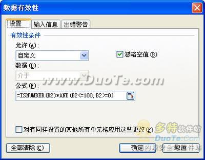公式含義:ISNUMBER(B2)表示必須是數字,AND(B2<=100,B2>=0)表示數據必須在0-100之間;兩個條件中用*號連接表示必須同時滿足兩個條件。
