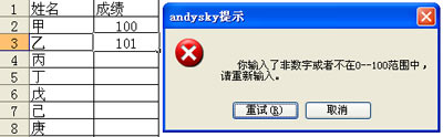 測試:在B2:B11區域輸入大于100或者小于0或者“ABC”等等數據看,系統將彈出提示并阻止您的輸入。從而確保成績錄入的范圍正確性(見圖3)。