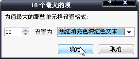 選中總分列,切換到“開始”菜單選項卡中,單擊“樣式”組中的“條件格式”按鈕,在隨后出現(xiàn)的下拉列表中,依次單擊“項目選取規(guī)則”/“值最大的10項”選項,打開“10個最大的項”對話框,如下圖所示。