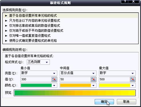先單擊“格式樣式”右側(cè)的下拉按鈕,在隨后出現(xiàn)的下拉列表中,選擇一種樣式;再設置“最小值”、“中間值”、“最大值”的類型,并根據(jù)表格的色彩搭配,調(diào)整好顏色。全部設置完成后,單擊“確定”按鈕返回即可,如下圖所示。
