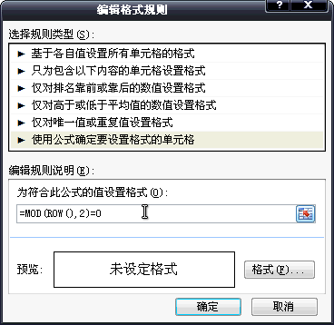 在“選擇規(guī)則類型”下面選中“使用公式確定要使用格式的”選項,然后在“為符合此公式的值設置格式”下面的方框中輸入公式:=MOD(ROW(),2)=1。