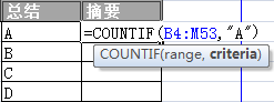 使用 COUNTIF 函數(shù)時,在范圍之后,請輸入搜索條件。舉例來說,如果想要統(tǒng)計輸入了“A”的單元格數(shù)量,則輸入“=COUNTIF(B4:M53,"A")”。