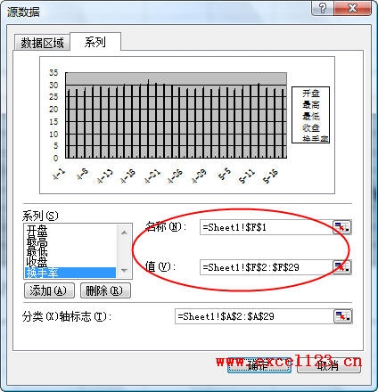 2.添加“換手率”系列:選擇圖表,單擊菜單“圖表→源數(shù)據(jù)→系列”,在對話框中單擊“添加”按鈕,將“名稱”設(shè)置為F1單元格,將“值”設(shè)置為F2:F29區(qū)域。