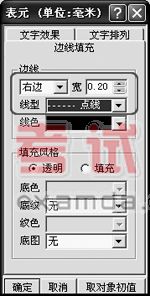 4、按下“Ctrl”鍵,選中表格的第1、3、5列,單擊工具欄的[對(duì)象屬性]按鈕,打開(kāi)“表元”對(duì)話框,單擊“邊線填充”選項(xiàng)卡,在“邊線”中,從列表框中選擇“右邊”,將其寬修改為“0.20”,在“線型”中選擇“點(diǎn)線”,單擊[確定]按鈕后退出,這樣第1、3、5列的右側(cè)邊線都設(shè)置為虛線。