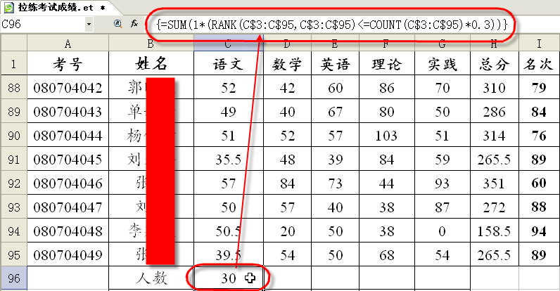 我們先求C列語(yǔ)文學(xué)科的前30%學(xué)生的人數(shù)。點(diǎn)擊C96單元格,在單元格中輸入如下公式“=SUM(1* (RANK(C$3:C$95,C$3:C$95)<=50*0.3))”,然后將鼠標(biāo)定位于編輯欄,按下“Ctrl+Shift+Enter”快捷鍵,可以看到在公式的外層自動(dòng)添加了數(shù)組公式的標(biāo)記??一對(duì)大括號(hào)。當(dāng)然,在C96單元格已經(jīng)可以看到符合條件的人數(shù)了。如圖2所示。