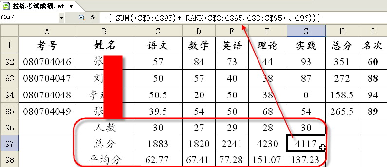 符合條件的學(xué)生成績(jī)的總分的求法與人數(shù)求法是基本一致的。只要在C97單元格輸入如下公式“=SUM((C$3:C$95)* (RANK(C$3:C$95,C$3:C$95)<=C96))”,然后一定記得按下“Ctrl+Shift+Enter”快捷鍵,就可以得到相應(yīng)的分?jǐn)?shù)了。