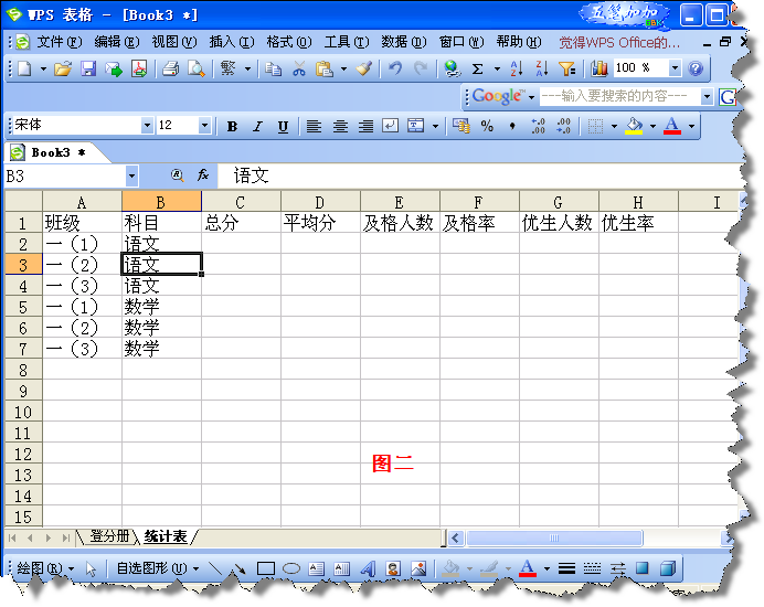 登分冊一般有班級、考號、姓名及語文、數(shù)學等學科名稱,我們可以把這個工作表建立在Sheet1,并將其重命名為“登分冊”,將學生成績輸入其中(見圖一)。將Sheet2命名為“統(tǒng)計表”,在其中設(shè)置好班級、科目、平均分、及格人數(shù)、及格率、優(yōu)生人數(shù)、優(yōu)生率等統(tǒng)計信息列標題,輸入班級和需要統(tǒng)計的科目內(nèi)容(如圖二)。