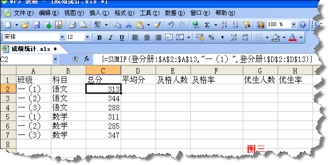 在“統(tǒng)計表”中的C2單元格輸入數(shù)組公式=SUMIF(登分冊!$A$2:A$13,"一(1)",登分冊!$D$2:D$13),按住Ctrl和 Shift鍵回車可以計算出一(1)班的總分,將公式向下復制到各單元格,并將其中的“一(1)”班分別改為相應班級名稱。這個數(shù)組公式的含義是:在“登分冊”工作表中查找“一(1)班對應的成績,并返回一(1)班所有成績之和。如圖三