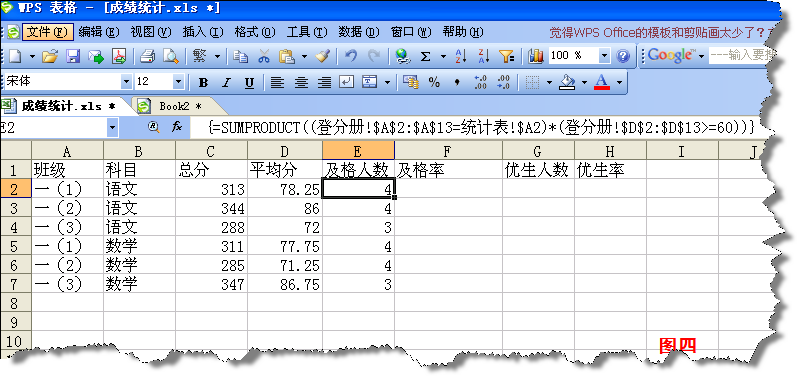 在E2中輸入數(shù)組公式計算及格人數(shù)。該數(shù)組函數(shù)為=SUMPRODUCT((登分冊!$A$2:A$13=統(tǒng)計表!$A2)*(登分冊!$D$2:D$13>=60)),其含義是:若“登分冊”工作表A列中有與“統(tǒng)計表”A2相同的信息,即“一(1)班”,則返回與“一(1)班”相對應的成績中大于或等于60分的人數(shù)(如圖四)。將公式向下復制后,在F2單元格中輸入公式=E2/COUNTIF(登分冊!$A$2:A$13,統(tǒng)計表!$A2)計算該班的及格率。