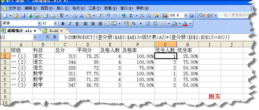 將E兩列中的公式復制到G列,并將公式是的">=60 "修改成學校規(guī)定的優(yōu)生標準(如是80分為優(yōu)生,則將60改為80即可)(如圖五)。同理,將F列中的公式復制到H列即可得到優(yōu)生率的統(tǒng)計結(jié)果。