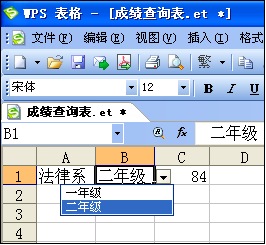2.在單元格B1單元,下拉列表中產(chǎn)生法律系對應(yīng)的兩個年級。從中選擇“二年級”,在C1單元格將會自動產(chǎn)生查詢結(jié)果:外語系三年級的成績84。見圖D所示;