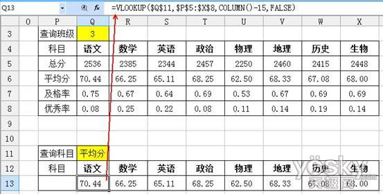 點擊Q13單元格,錄入公式=VLOOKUP($Q$11,$P$5:$X$8,COLUMN()-15,FALSE)