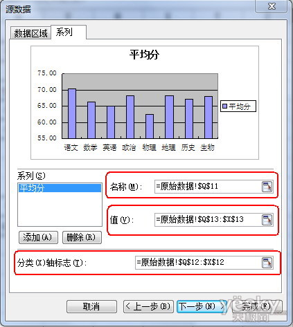 點擊菜單命令“插入→圖表”,打開“圖表類型”對話框。選中“簇狀柱形圖”類型,點擊“下一步”按鈕,點擊“系列”選項卡,在“名稱”右側的輸 入框中輸入“=原始數據!$Q$11”,在“值”右側的輸入框中輸入“=原始數據!$Q$13:$X$13”,在“分類X軸標志”右側的輸入框中輸入“= 原始數據!$Q$12:$X$12”,如圖4所示。