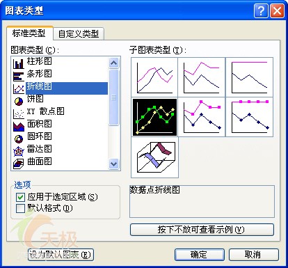 2.單擊第2個(gè)即2月的數(shù)據(jù)系列將其選中,然后選擇“圖形>圖形類型”,打開“圖形類型”對話框,選擇“折線圖”并單擊“確定”按鈕,如圖3所示。