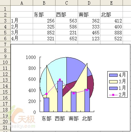 3.用同樣的方法將第3個(gè)和第4個(gè)數(shù)據(jù)系列的類型分別改為面積圖和餅圖,得到如圖4所示的結(jié)果,這樣我們就得到了一個(gè)同時(shí)具有4種類型的組合圖表。
