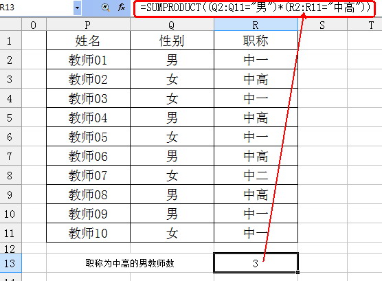 我們如果要統計表格中職稱為“中高”的男教師數,那么只需要在單元格中輸入公式“=SUMPRODUCT((Q2:Q11="男")*(R2:R11="中高"))”即可。相信對照表格和公式,公式的含義自然就清楚了。