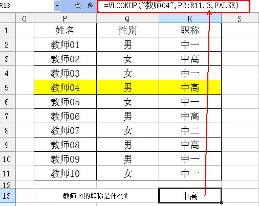 公式的含義是在P2:R11單元格區域的首列查找值為“教師04”的單元格,并返回其所在行的第三列數據。對照表格看一下就清楚了。