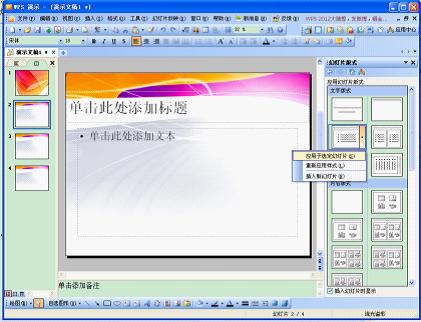 第三步,根據需要微調各個版式的格式。在菜單欄選擇“格式”——“幻燈片版式”,根據需要為每張幻燈片選擇版式,有多種版式可以選擇。如圖3