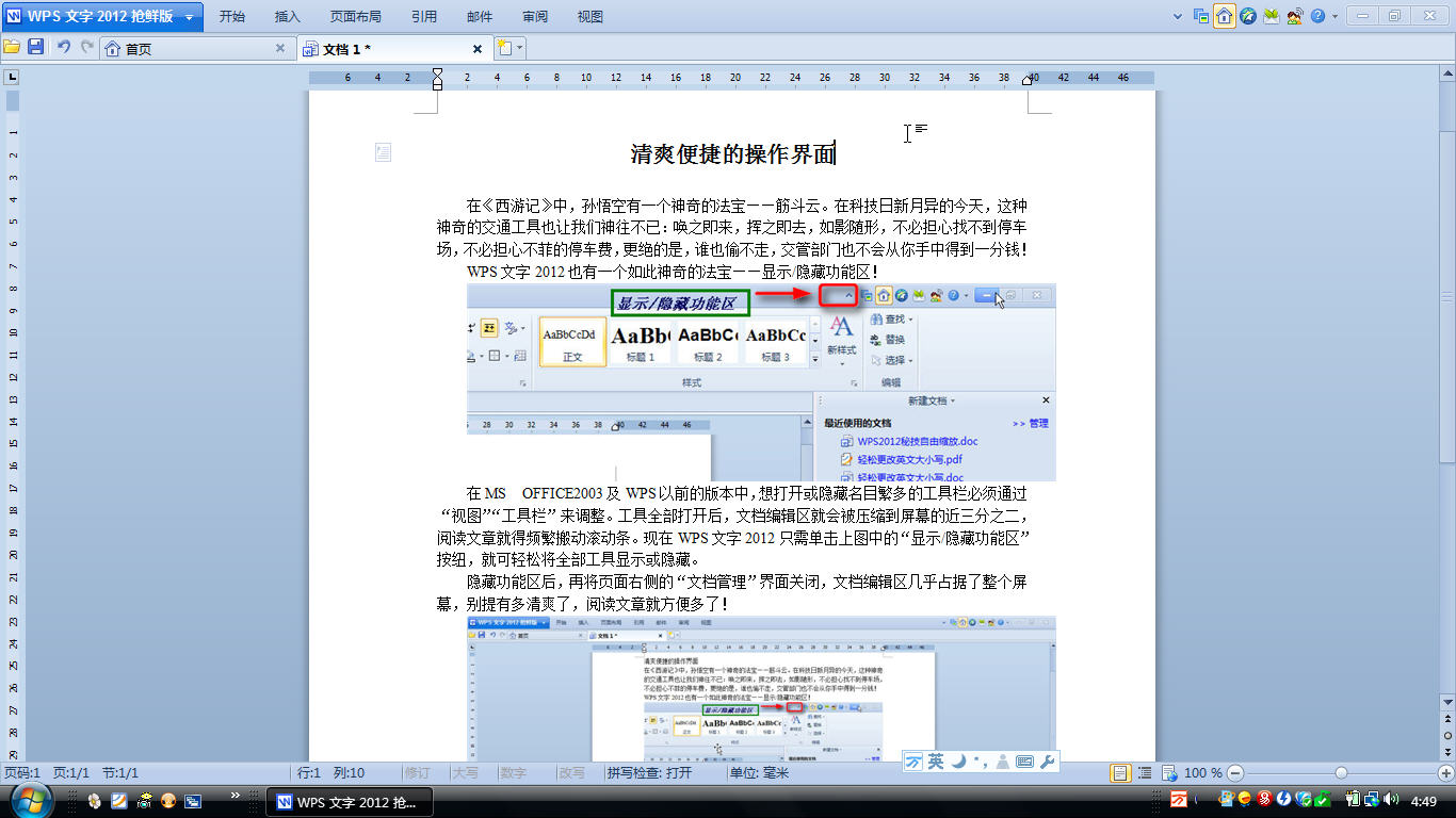 隱藏功能區(qū)后,再將頁面右側(cè)的“文檔管理”界面關(guān)閉,文檔編輯區(qū)幾乎占據(jù)了整個屏幕,別提有多清爽了,閱讀文章就方便多了!