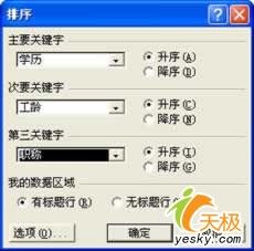如果我們需要按“學歷、工齡、職稱”對數據進行排序,可以這樣操作:選中數據表格中任意一個單元格,執行“數據→排序”命令,打開“排序”對話框(圖2),將“主要關鍵詞、次要關鍵詞、第三關鍵詞”分別設置為“學歷、工齡、職稱”,并設置好排序方式(“升序”或“降序”),再按下“確定”按鈕就行了。