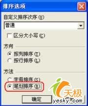 對“姓名”進行排序時,國人喜歡按“姓氏筆劃”來進行:選中姓名列任意一個單元格,執行“數據→排序”命令,打開“排序”對話框(參見圖2),單擊其中的“選項”按鈕,打開“排序選項”對話框(圖3),選中其中的“筆劃排序”選項,確定返回到“排序”對話框,再按下“確定”按鈕即可。