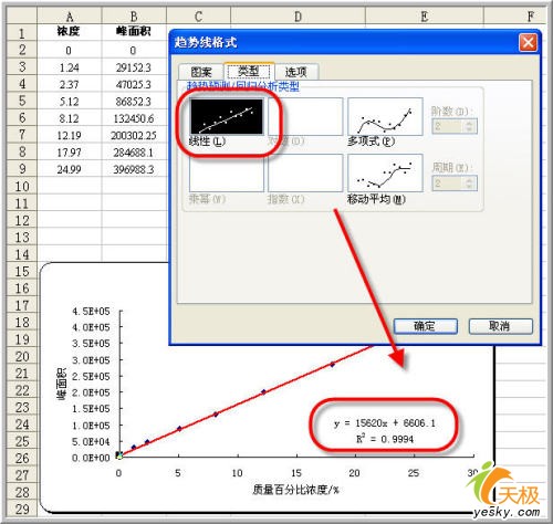 在選項(xiàng)卡中顯然詳細(xì)多了,注意選擇X、Y對(duì)應(yīng)的數(shù)據(jù)列。“常數(shù)為零”就是指明該模型是嚴(yán)格的正比例模型,本例確實(shí)是這樣,因?yàn)樵跐舛葹榱銜r(shí)相應(yīng)峰面積肯定為零。先前得出的回歸方程雖然擬合程度相當(dāng)高,但是在x=0時(shí),仍然有對(duì)應(yīng)的數(shù)值,這顯然是一個(gè)可笑的結(jié)論。所以我們選擇“常數(shù)為零”。