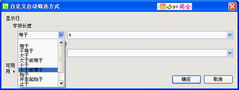 “自定義自動篩選方式”對話框彈出,選中“字符長度”小于或等于4,確定。