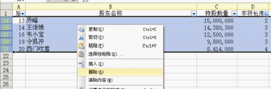 表格僅顯示“股東名稱”字符長度小于或等于4的記錄,刪除之。