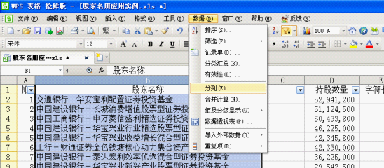 4、接下來對機構投資者進行處理,以得到我們想要的數據。我們知道,股東名稱“-”之前的銀行名稱是機構投資者的托管銀行名稱,之后的才是機構投資者名稱。那我們必須先將他們分開。首先在“股東名稱”字段后插入一空白列,接著點擊“數據-分列”。