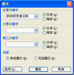 “排序”對話框彈出,主要關鍵字為“機構投資者名稱”字段、升序,確定。