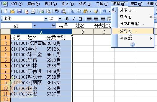 2.選中A列,在“數據”菜單中,單擊“分列”命令,如圖3。