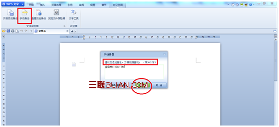在“手動備份”這個選項里則有一個很特別的功能,當你編輯資料到一定程度,覺得有必要保存時就可以點擊這個選項,而且點擊后彈出的對話框里可以輸入你需要的對這個文檔的備注。