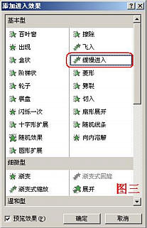 單擊“添加效果”右側的下拉按鈕,在隨后出現的下拉列表中,展開“進入”下面的級聯菜單,選中其中的“其他效果”選項,打開“添加進入效果”對話框(如圖三),再選中其中的“緩慢進入”選項,“確定”返回。