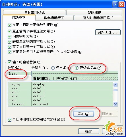 在打開的“自動更正”對話框中,點擊“自動更正”選項卡,然后在下方的“替換”輸入框中輸入“dizhi”,然后選中右側的“帶格式文本”單選項,并點擊下方的“添加”按鈕,如圖3所示。確定后,只要我們在文檔中輸入“dizhi”并按下空格鍵,那么原先設置好的那些通訊信息就立刻顯示出來了,非常方便。