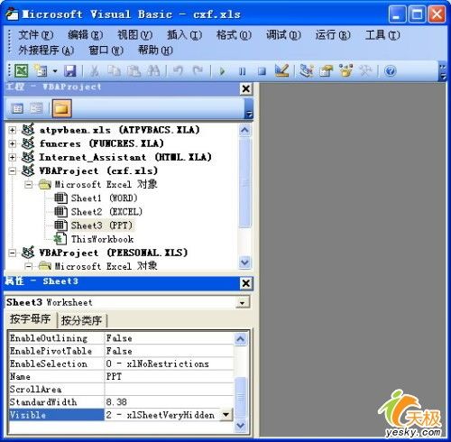 4、選中相應(yīng)工作簿中需要隱藏的工作表(如“Sheet3(PPT)”),然后在下面的屬性窗口中,找到“Visible”選項,單擊其右側(cè)的下拉按鈕,在隨后出現(xiàn)的下拉列表中,選擇 “0-xlSheetVeryHidden”選項。